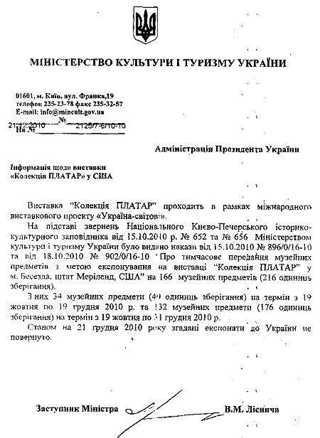 В частности, согласно документу, Минкульт издал приказы о временном передаче музейных предметов с целью экспонирования на выставке "Коллекция Платар" в городе Бесезда, штат Мэриленд, США на 166 музейных предметов (216 единиц хранения).