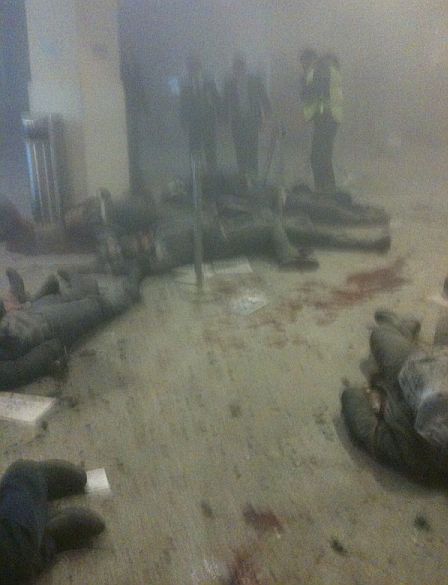 В аэропорту біло сильное задымление. Зона прилета была закрыта. По громкой связи ничего не объявляли более получаса после взрыва, сообщали очевидцы в "Твиттере". В зоне прилета не меньше десятка прикрытых трупов.