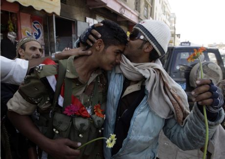 | Протестующий целует солата, перешедшего на сторону оппозиции. REUTERS/Ammar Awad |