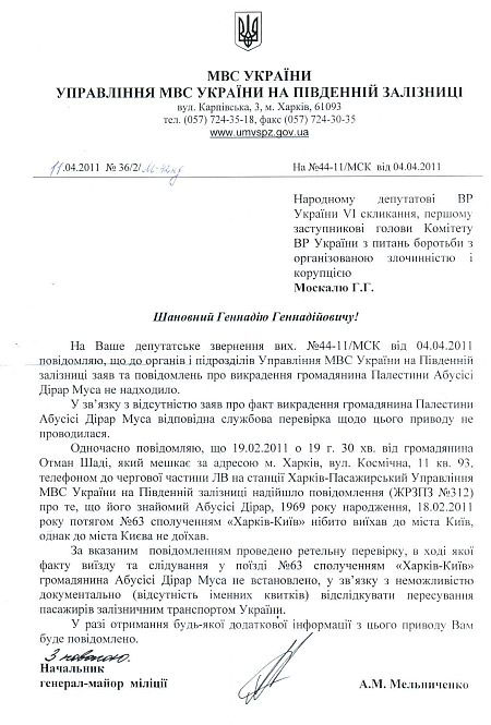 "Более того, как утверждает руководство управления, "тщательная проверка" в ответ на телефонный звонок знакомого палестинца о его исчезновении в поезде закончилась тем, что "... факта выезда и следования в поезде №63 сообщением "Харьков - Киев" гражданина Абусиси Дирар Муса не установлено", - отметил Москаль.