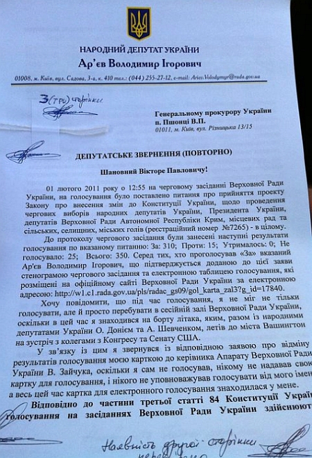 Позже Арьев обратился в Генпрокуратуру с просьбой расследовать инцидент с голосованием его карточки за изменения в Конституцию в его отсутствие в сессионном зале.