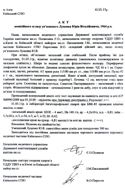 "Второй документ – "Акт комиссионного осмотра заключенного Луценко Юрия Витальевича, 1964 г.н.", составленный также 2 мая тремя медиками пенитенциарной системы. В этом документе приведены результаты анализов и четко зафиксирован вывод: "Отказ от принятия пищи". Оба документа составлены в учреждении, которое подчиняется Генпрокуратуре, поэтому в их аутентичности сомнений нет", - подчеркивается в заявлении.