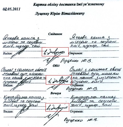 Пресс-служба приводит "Карточку учета доставки пищи заключенному Луценко Юрию Витальевичу" за 2 мая. На этом документе четко видны три пометки Юрия Луценко: "отказался", и стоит его подпись.