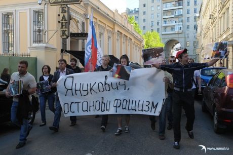 Прокремлевское движение "Россия Молодая" в среду перед украинским посольством в Москве провело акцию в связи с событиями во Львове.