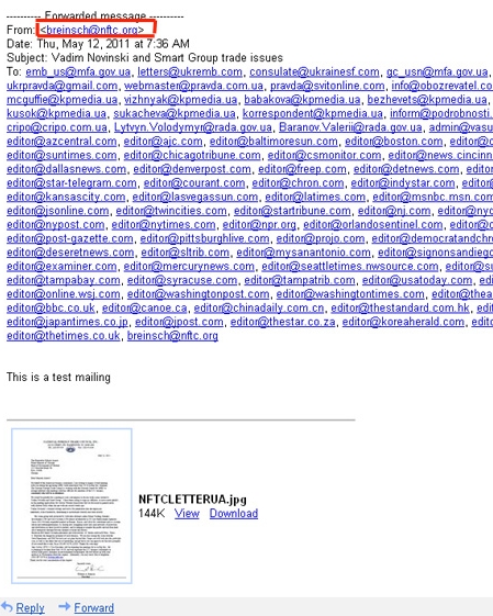 Письмо о якобы нелегальных операциях Новинского в редакцию "Экономической правды" и ряду редакторов других изданий поступило с адреса [email protected], который поиск в Google выдает как электронный адрес Рейнша и в котором буквы nftc соответствуют аббревиатуре возглавляемого им совета National Foreign Trade Council.