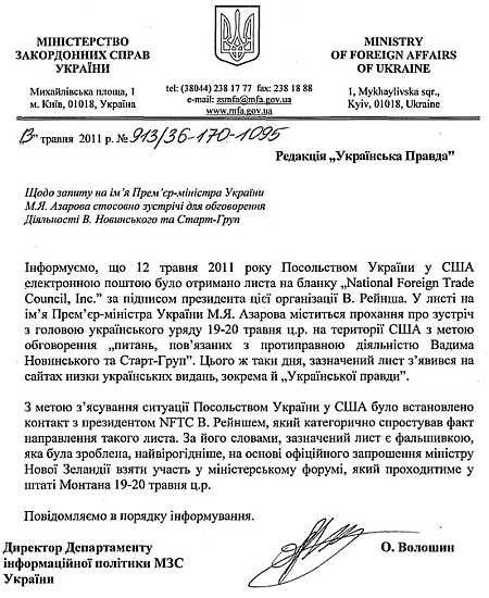 12 мая в редакцию "Экономической правды" по электронной почте пришло сфальсифицированное письмо за подписью руководителя Национального совета иностранной торговли США (National Foreign Trade Council) на имя украинского премьер-министра Николая Азарова.