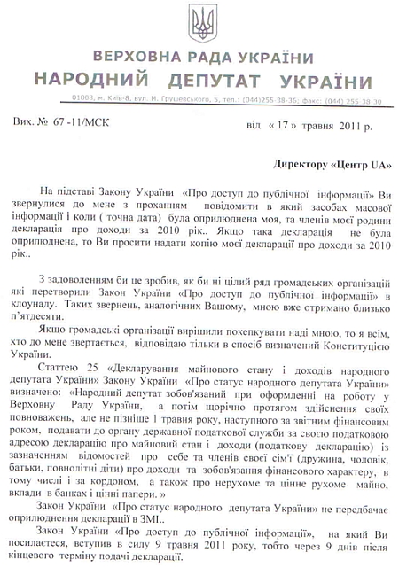В своем ответе на него Москаль отмечает, что с удовольствием предоставил бы копию декларации, если бы к нему с аналогичной просьбой не обратились бы еще около 50 общественных организаций, которые "превратили закон "О доступе к публичной информации" в клоунаду".