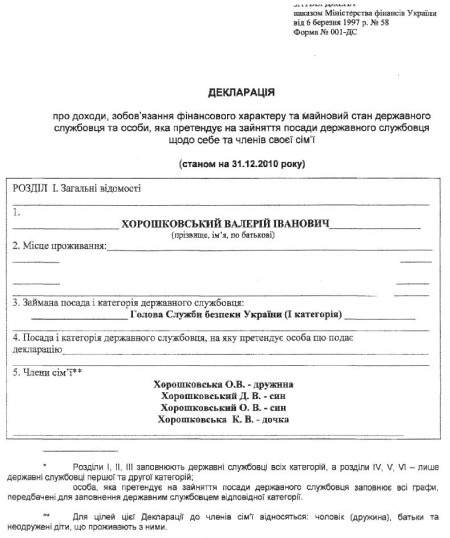 Глава Службы безопасности Валерий Хорошковский в 2010 году получил 5 миллионов 154 тысяч гривен совокупного дохода.