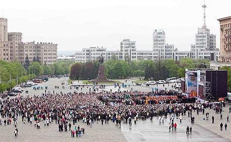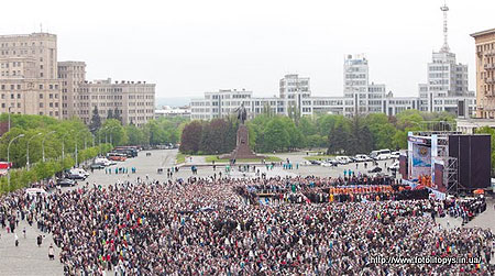 Как известно, 7-8 мая глава Русской православной церкви патриарх Кирилл посещал Харьков. Одним из мероприятий, проведенных им в эти дни, была литургия на центральной площади Свободы, которая и зафиксирована на фотографии.