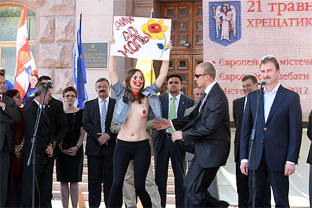 Во время выступления главы КГГА Александра Попова на площадку перед трибуной, где находились министр иностранных дел Константин Грищенко, глава представительства Евросоюза в Украине Жозе Мануэль Пинту Тейшейра и другие официальные лица, выбежали две девушки с обнаженной грудью.