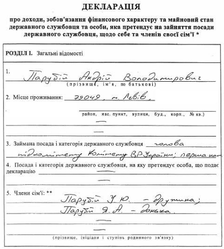 Семья Парубия (жена и дочь) в 2010 году получили почти 14,4 тысяч гривен заработной платы.