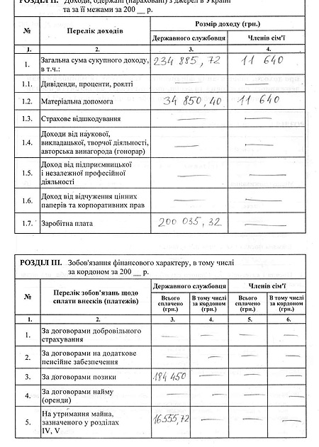 Кириленко имеет финансовые обязательства: по договорам займа - 184,4 тысячи гривен, на содержание имущества - 16,5 тысяч.