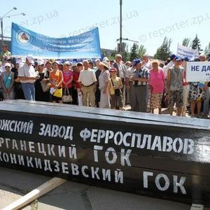 В черном гробу, который поставили в центре протестующих, заводчане "хоронят" Запорожский ферросплавный завод, Марганецкий ГОК и Орджоникидзевский ГОК (горнообогатительный комбинат).