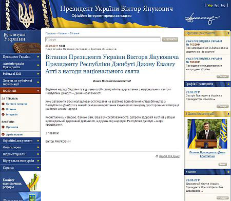 Президент Виктор Янукович поздравил президента Ганы Джона Эванса Атту с Днем независимости другой страны - Джибути.