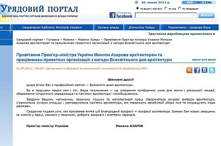 Премьер Николай Азаров 1 июля поздравил архитекторов со "Всемирным днем архитектуры", который отмечается в первый понедельник октября.