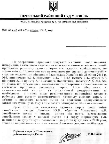 "Сообщаем, что согласно изменениям в Положение об автоматизированной системе документооборота суда, утвержденными решением Совета судей Украины от 21 января 2011 №4 исключены пункты..., которые касались автоматического создания автоматизированной системой протокола распределения дел, его хранения в автоматизированной системе и возможности распечатки по необходимости, а также относительно распечатки конце каждого рабочего дня", - уточнили в суде.