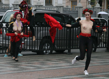 Девушки в веночках на головах и топлес пробежали около центрального входа здания парламента, выкрикивая при этом: "Долой бычью реформу!".