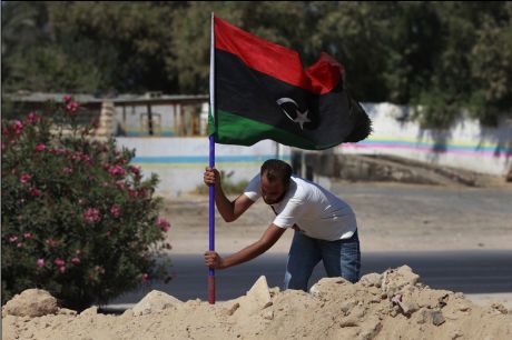 | Мужчина ставит флаг повстанцев в городе на пути к Триполи. фото Reuters |