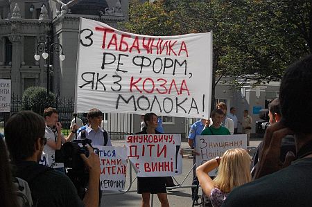 Как передает корреспондент агентства "Интерфакс-Украина", собравшиеся держат плакаты с надписями: "С Табачника реформ, как с козла - молока", "Прочь министра - шлепера из образования!", "Образованием руководит козел?".