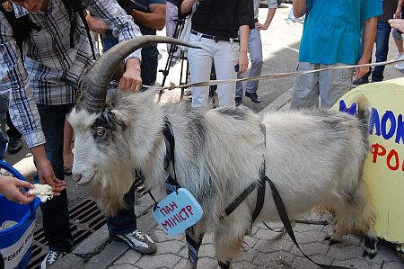 Организаторы привели под здание администрации президента живого козла, который символизирует Табачника, пришедшего на прием к президенту Украины Виктору Януковичу.