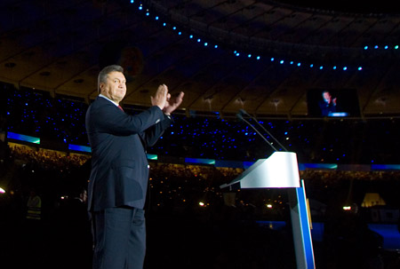 "Успешная реконструкция стадиона несомненно стала показательным проектом для имиджа Украины ... Готовность одной из важнейших арен чемпионата по футболу Евро-2012 убедила мировую общественность, что с Украиной можно иметь дело", - сказал Янукович.