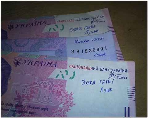 Как сообщает Gazeta.ua, инициаторы призывают писать на обратной стороне каждой денежной купюры в верхнем правом углу надпись: "Зека геть!".