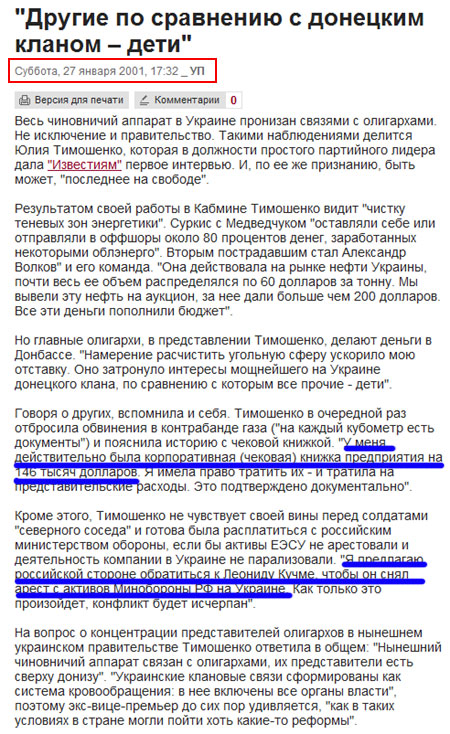| Скриншот страницы "Украинской правды" за 27 января 2001 года. Ответы Тимошенко совпадают с ответами в"новом" интервью |