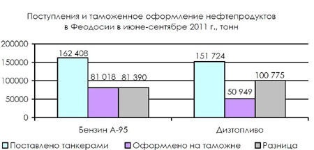 Так, с июня по сентябрь 2011 таможенное оформление поступающих на Феодосийскую нефтебазу в режиме импорта прошли только 50% объемов бензина А-95 и только 30% дизельного топлива.