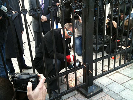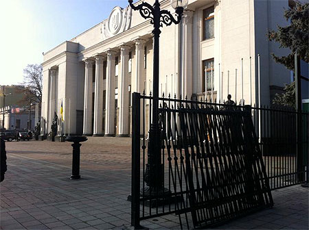 Депутаты от оппозиции спилили болгаркой часть забора возле Верховной Рады.