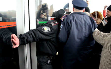 Между участниками митинга и охраной обладминистрации произошла потасовка, в результате которой была выломана пластиковая дверь на входе в вестибюль и выбиты стекла.
