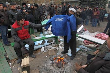 Голодающие в Донецке чернобыльцы сожгли на костре синюю куртку с символикой Партии регионов и надписью "Янукович – наш президент".