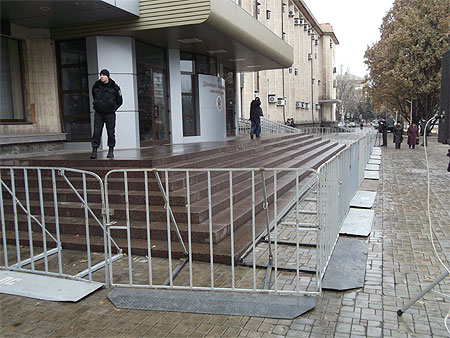 На улице дежурят 6 милиционеров, в здании горсовета находится еще несколько десятков правоохранителей.