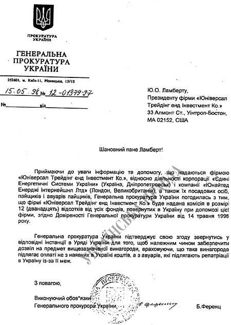 "Генеральная прокуратура Украины этим доверяет американским адвокатам Питеру Дж.Куку и Джозефу Б. Грину, которые представлены Генеральной прокуратуре фирмой UTICo, оказывать помощь Генеральной прокуратуре Украины и представлять ее в различных правовых вопросах за пределами Украины относительно пайщиков и авуаров корпорации ЕЭСУ..." , - говорится в доверенности Ференца от 14 мая 1998 года.