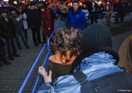 Когда карусель остановилась, на место подошли сотрудники спецподразделения "Беркут", которые задержали всех, кто держал в руках плакаты.