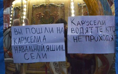 Во время того, как карусель начала двигаться, граждане достали плакаты с надписями: "Мимо ЦентрИзбирКома я без флага не хожу, то им бюллетень просуну, то им рейтинг покажу", "Я против фальсификаций", "Мишки крутят карусели, чтобы жулики не сели".
