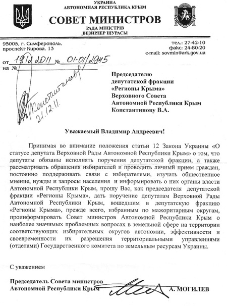 Глава Совмина Крыма Анатолий Могилев обратился к фракции Партии регионов в крымском парламенте с просьбой проинформировать его о наиболее значимых земельных проблемах региона.