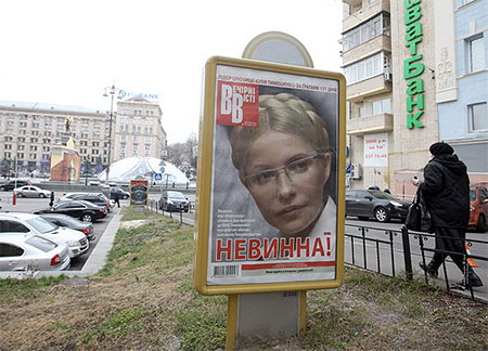 В понедельник в Киеве были демонтированы все ситилайты с первой полосой газеты "Вечерние вести", на которой был изображен портрет Юлии Тимошенко с подписью "Невиновна!".
