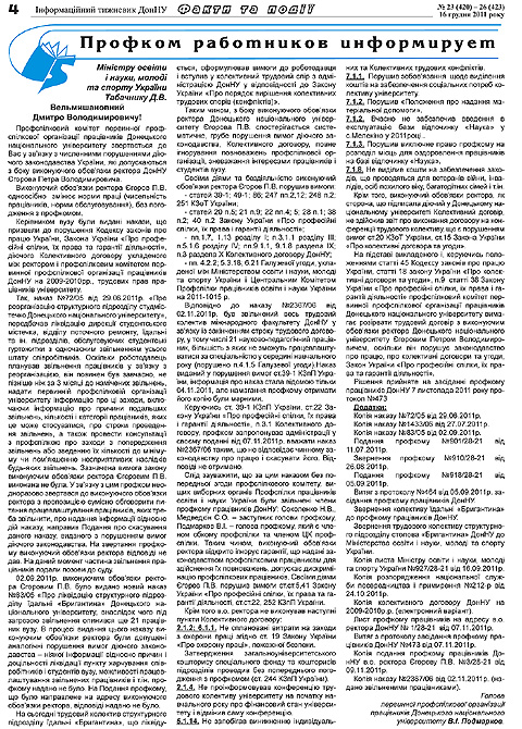 Ранее профсоюзный комитет Донецкого университета, рассмотрев трудовой спор и.о. ректора Петра Егорова с уволенными им преподавателями международного факультета, признал действия администрации вуза незаконными.