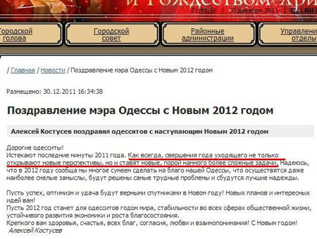 "Дорогие одесситы! Истекают последние минуты 2011 года. Как всегда, свершения года уходящего не только открывают новые перспективы, но и ставят новые, порой намного более сложные задачи", - начинается поздравление мэра.