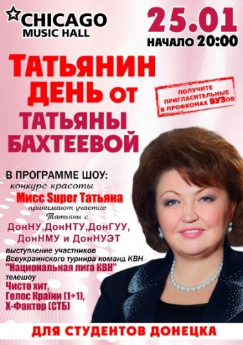 По словам Бахтеевой, несколько недель назад к ней обратились представители Донецкой областной общественной молодежной организации "Творческая молодежь Донбасса" с просьбой посодействовать в организации мероприятия, приуроченного к Международного дня студента и Дня Татьяны.