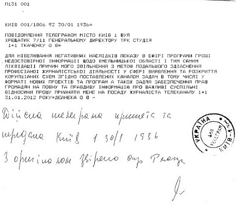 "Для нивелирования негативных последствий показа в эфире программы "Гроші" недостоверной информации о Хмельницкой области и тем самым ликвидации причин моего увольнения с целью дальнейшего осуществления профессиональной журналистской деятельности в сфере выявления и раскрытия коррупционных схем согласно поставленным каналом задач, в том числе в формате новых проектов и программ, а также ради обеспечения прав граждан на полную и правдивую информацию о важном общественном отношении прошу принять меня на должность журналиста телеканала "1+1"" – говорится в телефонограмме.