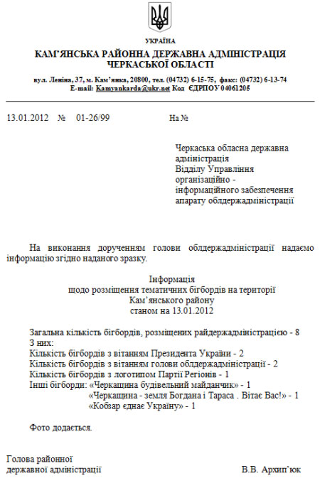 Чиновник в письме отчитался губернатору, что по состоянию на 13 января 2012 года райгосадминистрацией было размещено 8 билбордов.