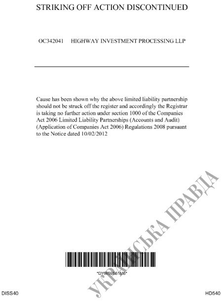 Согласно сообщению от 10 января 2012 года, компания Highway Investment Processing LLP должна быть ликвидирована по истечению трех месяцев, т.е. 10 апреля 2012 года.