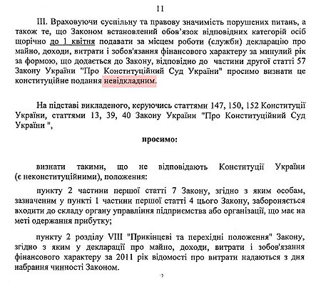 Об этом говорится в представлении в КС 53 депутатов от Партии регионов, текст которого имеется в распоряжении "Украинской правды".