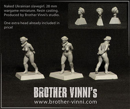 "Игровая миниатюра 28 мм изображает обнаженную пленную девушку с украинской национальной прической. Фигурка укомплектована дополнительной головой квадратной подставкой. Материал - смола", - говорится в описании миниатюры.