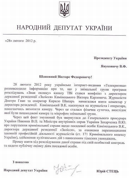 В свою очередь глава комитета Верховной Рады по вопросам свободы слова Юрий Стець обратился к генпрокурору Виктору Пшонке и главе МВД с просьбой возбудить против Каминецкого уголовное дело по признакам препятствования законной профессиональной деятельности журналистов.