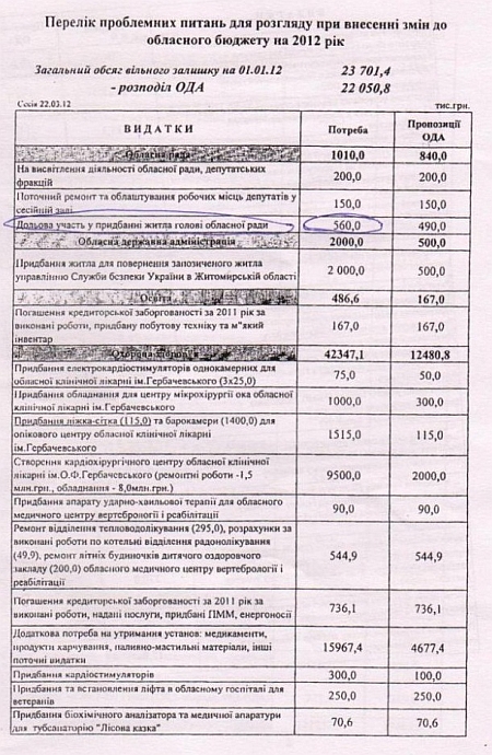 Об этом говорится в документе под названием "Перечень проблемных вопросов для рассмотрения при внесении изменений в областной бюджет на 2012 год", передают "Комментарии".
