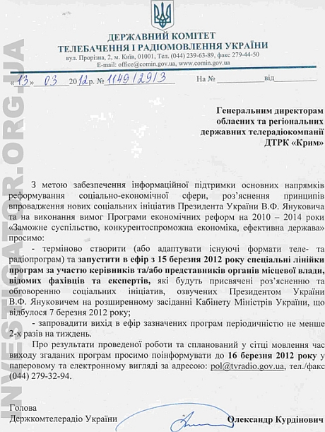 Госкомитет по телерадиовещанию рассылает на областные ТРК письма, в которых просит запустить программы о социнициативах Януковича, а также о других сюжетах.