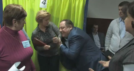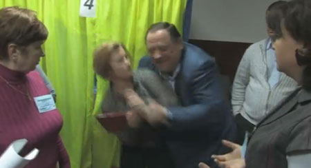 Нардеп от Партии регионов Петр Мельник пытался силой вытеснить из участка депутата от НУНС Ирину Геращенко.