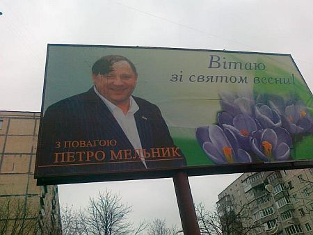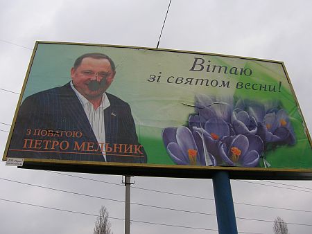 Билборд с поздравлением народного депутата от Партии регионов Петра Мельника в городе Вишневое обляпали краской.